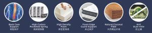 Natural coconut fibre acts as a body support with moisture-absorbing properties within the mattress layers. At the same time, it provides good ventilation and breathability, anti-odour, anti-bacterial and anti-static. High-carbon pocketed springs are extremely strong and more durable than standard steel springs, providing great spinal support.