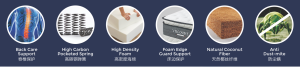 Natural coconut fibre acts as a body support with moisture-absorbing properties within the mattress layers. At the same time, it provides good ventilation and breathability, anti-odour, anti-bacterial and anti-static. High-carbon pocketed springs are extremely strong and more durable than standard steel springs, providing great spinal support.